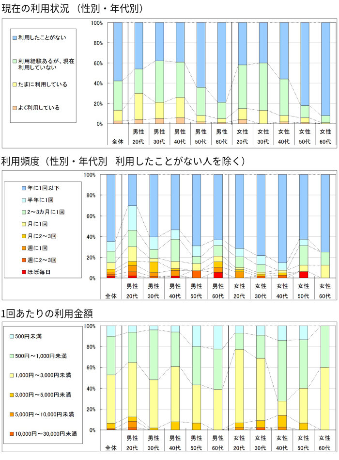 私はオープン席(飲み放題カフェ)を週1回程度、30分以内で利用するくらいだが、統計結果で50歳代・60歳代男性が500円以下/1回の利用者が他の年齢層に比べて多い実態にあっているなぁと感じつつ、この調査結果を読んだ。