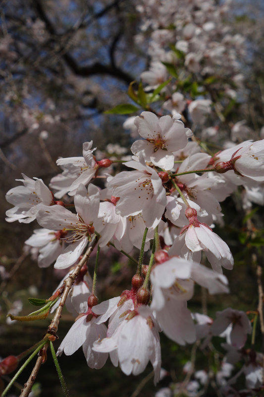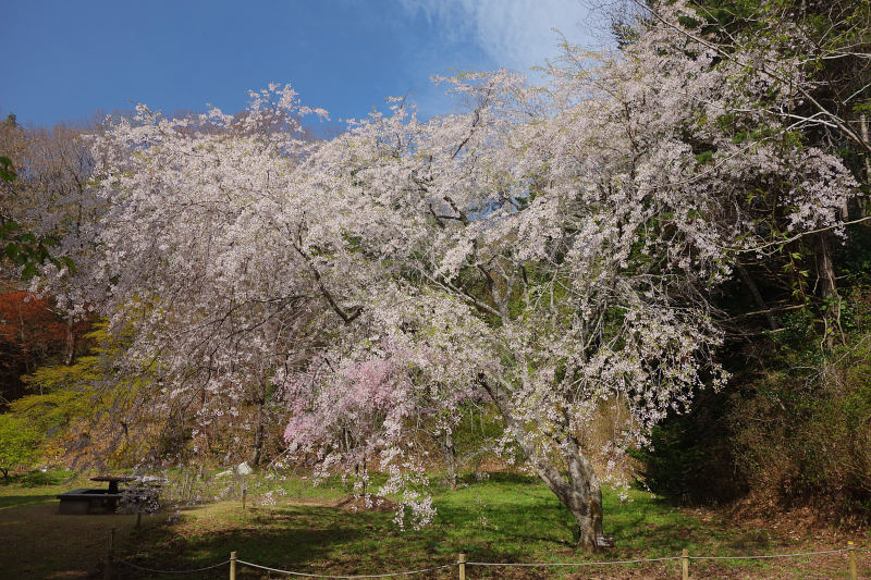 トイレのある東屋が面する園路を横切ると、さくら園となる。白いオオシマザクラやピンク色の枝垂れ桜が満開だ。