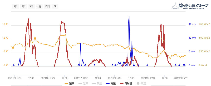 最も近い気象観測ポイントは槍ヶ岳山荘と思われるので、そこのデータを転載する。