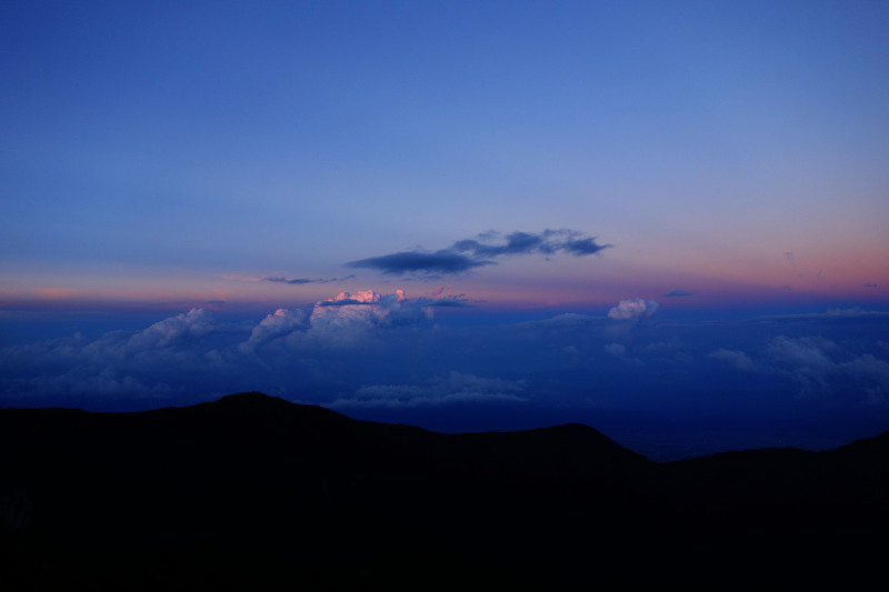 星空を見に外へ出てみると、小屋の周囲はガスに覆われている。天頂付近に星がチラッと見えた気もしたので、ガスは稜線を吹き抜けているだけで薄いものなのかもしれない。