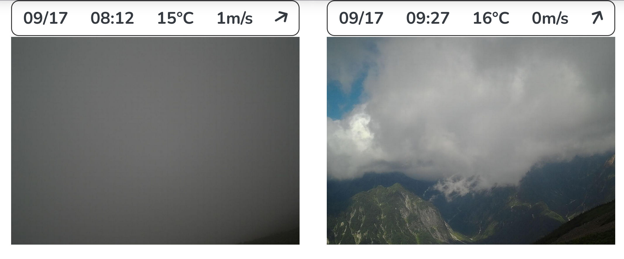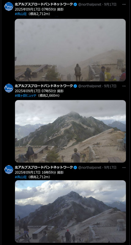常念山脈の南端(蝶ヶ岳)と北端(燕岳)で、ほぼ一日じゅう中層雲に覆われてはいたが雨は降っていないという状況だったようだ。