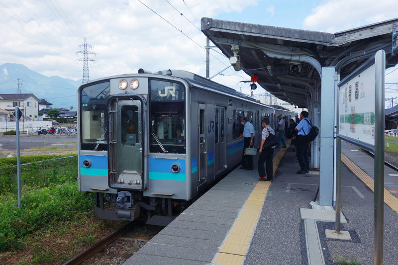 JR穂高駅にやってきた松本行きの普通列車(E127系 2両編成)