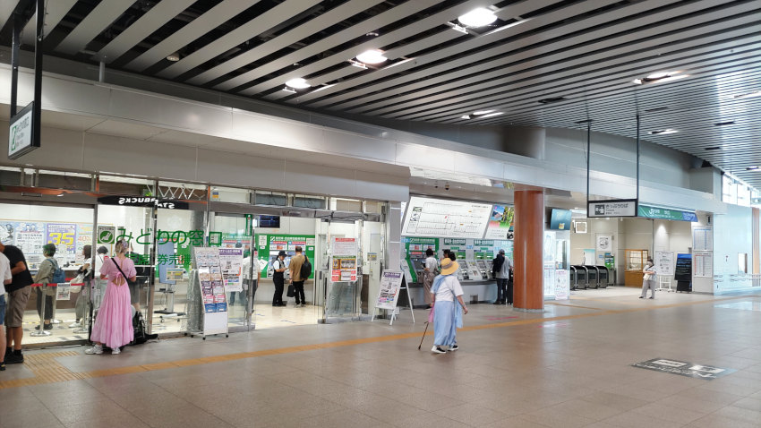 JR松本駅。改札とみどりの窓口の間に指定席券売機がある。行列のできているみどりの窓口よりも券売機のほうが断然スピーディー