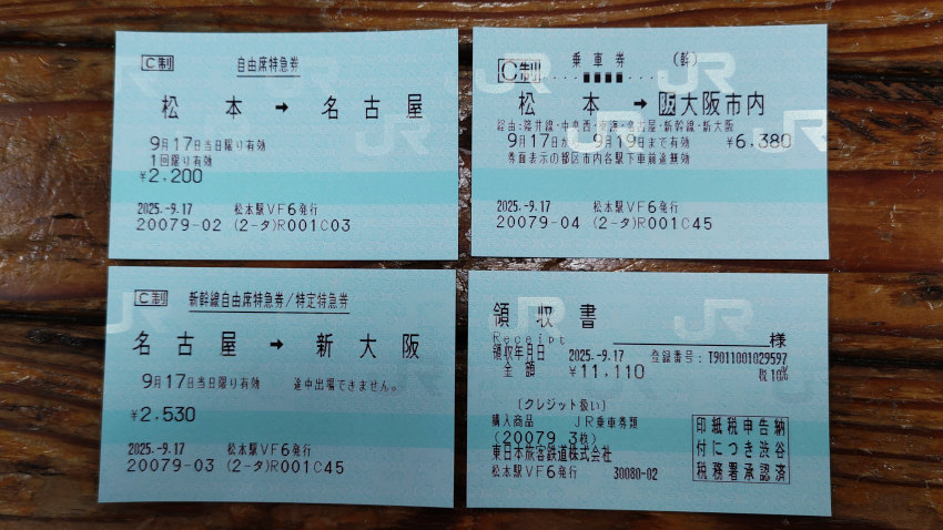 松本発 大阪行きの切符。自由席の特急・新幹線乗り継ぎで11,110円