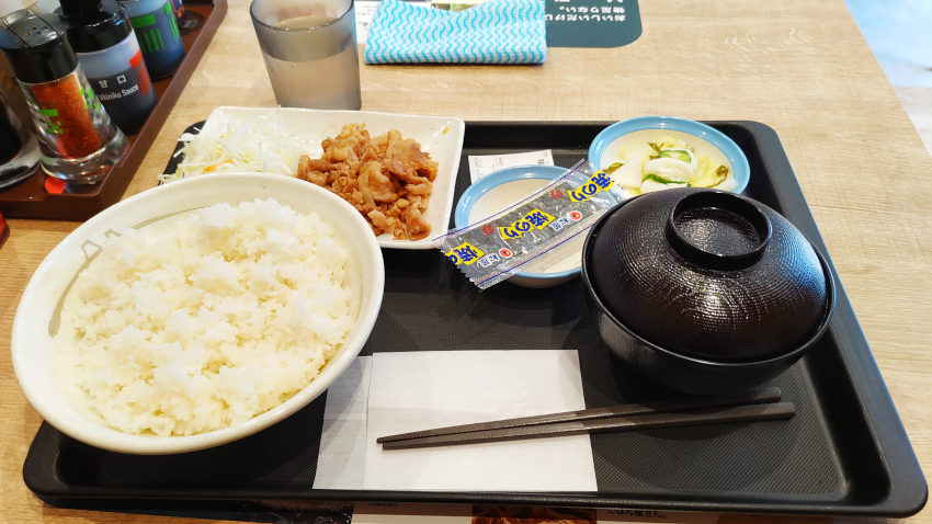 昼食は松屋のモーニング 「得朝牛皿定食」(ご飯特盛でも 400円)