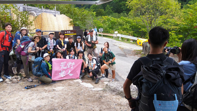 登山開始の記念撮影を行っている台湾からの登山者たち(大天井岳・槍ヶ岳を経由して上高地に降りるらしい)
