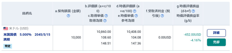 米国内での2045年5月償還・利金率5%の20年債取引価格は売り104.133USD、買い104.355USDであり、SBI証券の買い106.96USDは証券会社プレミアムなのだろうか。