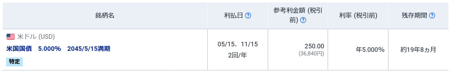 10,000USDの5%が年間の利金額なので、これを年2回で割ると1回あたり250USD(約36,840円)となり、あっている。