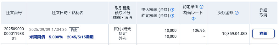購入予約時に提示された概算受渡金額の10,859.04USDに対して、同額が表示されており問題ない。