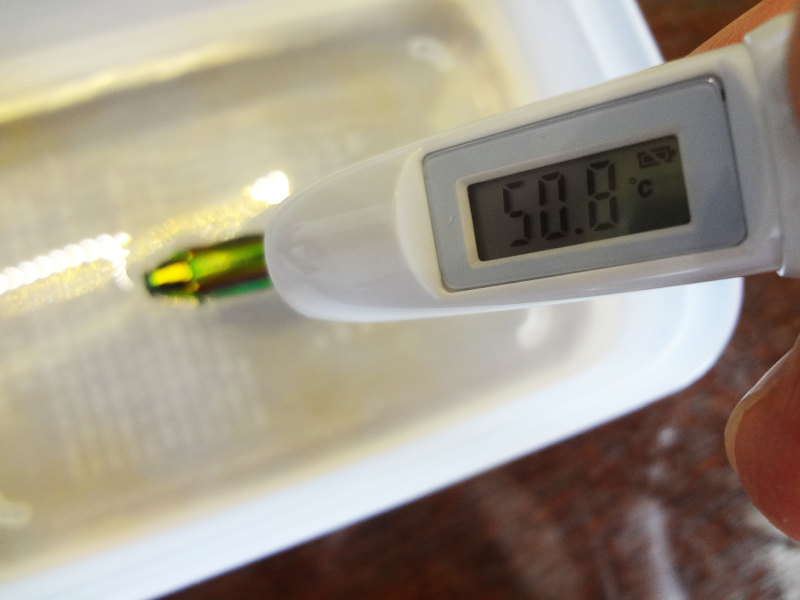 60℃のお湯につけることにする。IHヒーターで63℃くらいまで温めた湯を、食品用シール容器に入れて、たま虫の死骸を投入する。