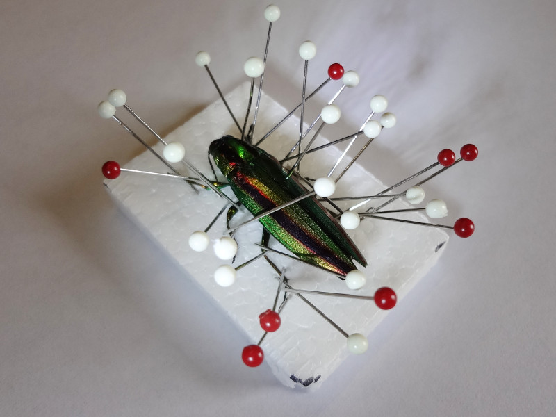 最初は、タマムシのど真ん中、少し右側にマチ針を1本ぶっ刺して虫本体を固定する。それから、それぞれの足を、あるべき位置に伸ばしてマチ針で固定していく。