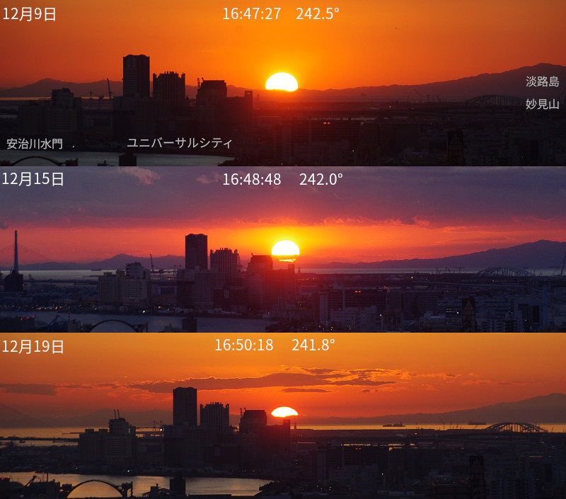 日没の位置がかなりのスピードで淡路島の妙見山付近から南に移動してきて、ユニバーサルシティに近づくほどにゆっくりとなり、ついに極値(最も南)に達したのが冬至の数日前。