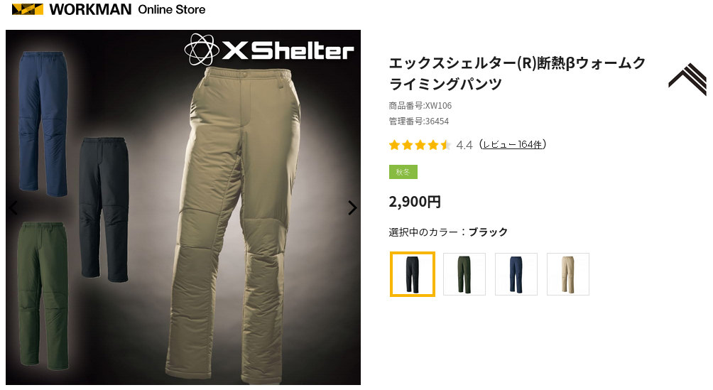 ワークマン エックスシェルター 断熱βウォームクライミングパンツ 2,900円