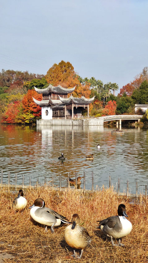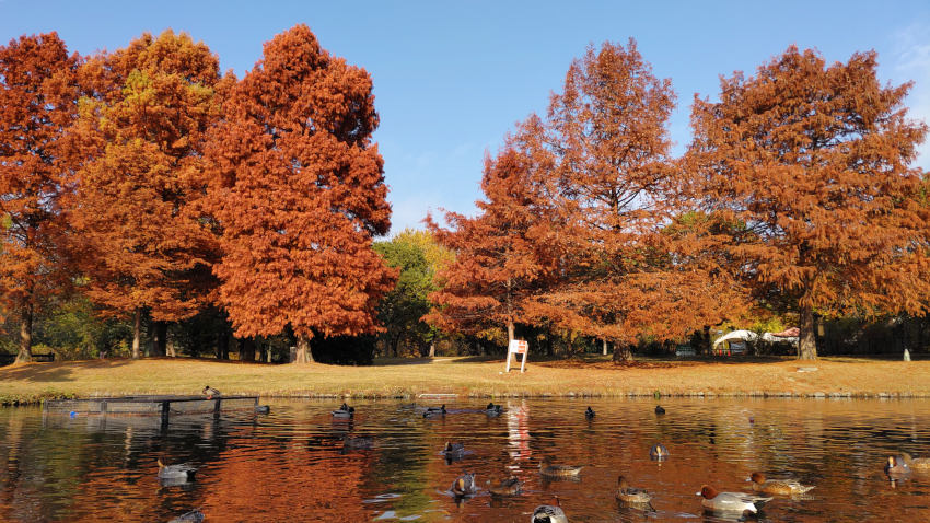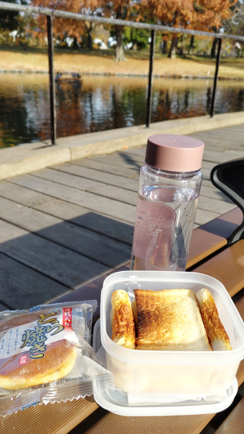 3日前と同じく、きょうも下池の親水テラスでカモを眺めながら昼食を食べることにする。