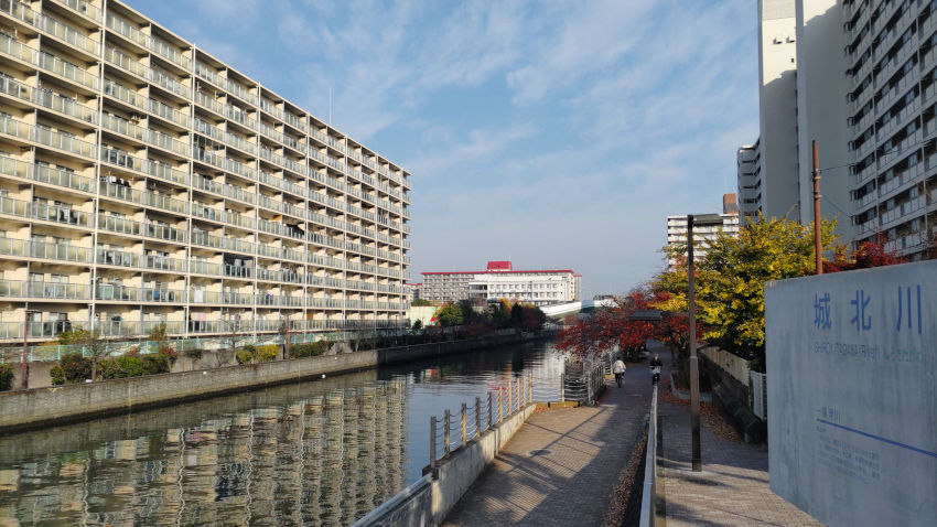 城北公園から城北筋を800mほどまっすぐ南へ行き、城北川遊歩道(旧城北運河)に入る。
