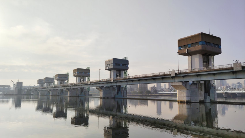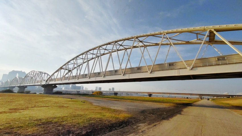 淀川大橋から6分、梅田を対岸に望むNTT十三専用橋をくぐり抜ける