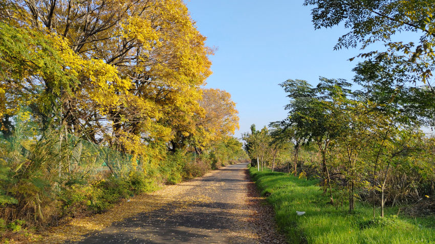 斜め右方向に太陽がある、逆光の中のサイクリング。黄砂の影響で光は少し柔らかだ。