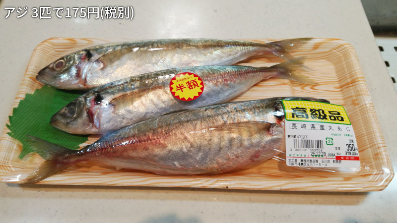 アジは内臓取って真ん中で切って姿焼きに。1匹は2人分になる。鱗が飛び散るのでさばいた後はキッチンの清掃が必要。