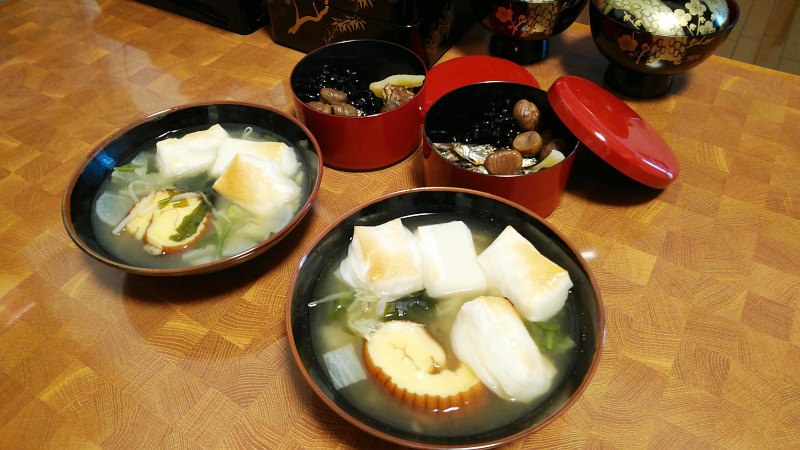 朝食は、日頃と同じく具だくさんのトーストと牛乳。昼食が「おせち」「雑煮」。
