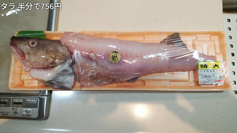 フニャフニャでさばきにくいタラだが、めずらしく半分にさばかれた状態で売られていた。仲卸の店でこのサイズのものがさばかれているのは珍しい。骨なし半身の注文があって、残りを売っているのだろうか...。