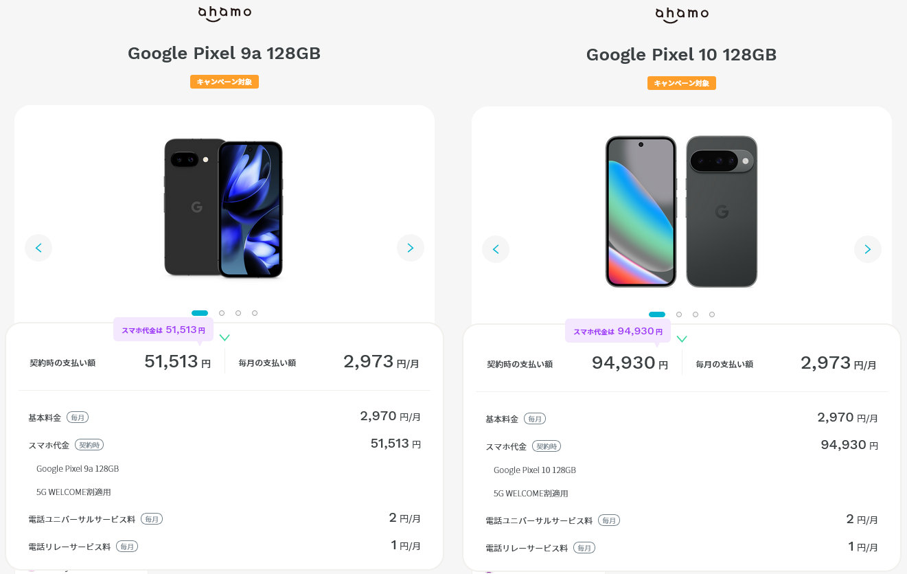 ahamoで一括払・MNP割引を適用したGoogle Pixel 10と9a