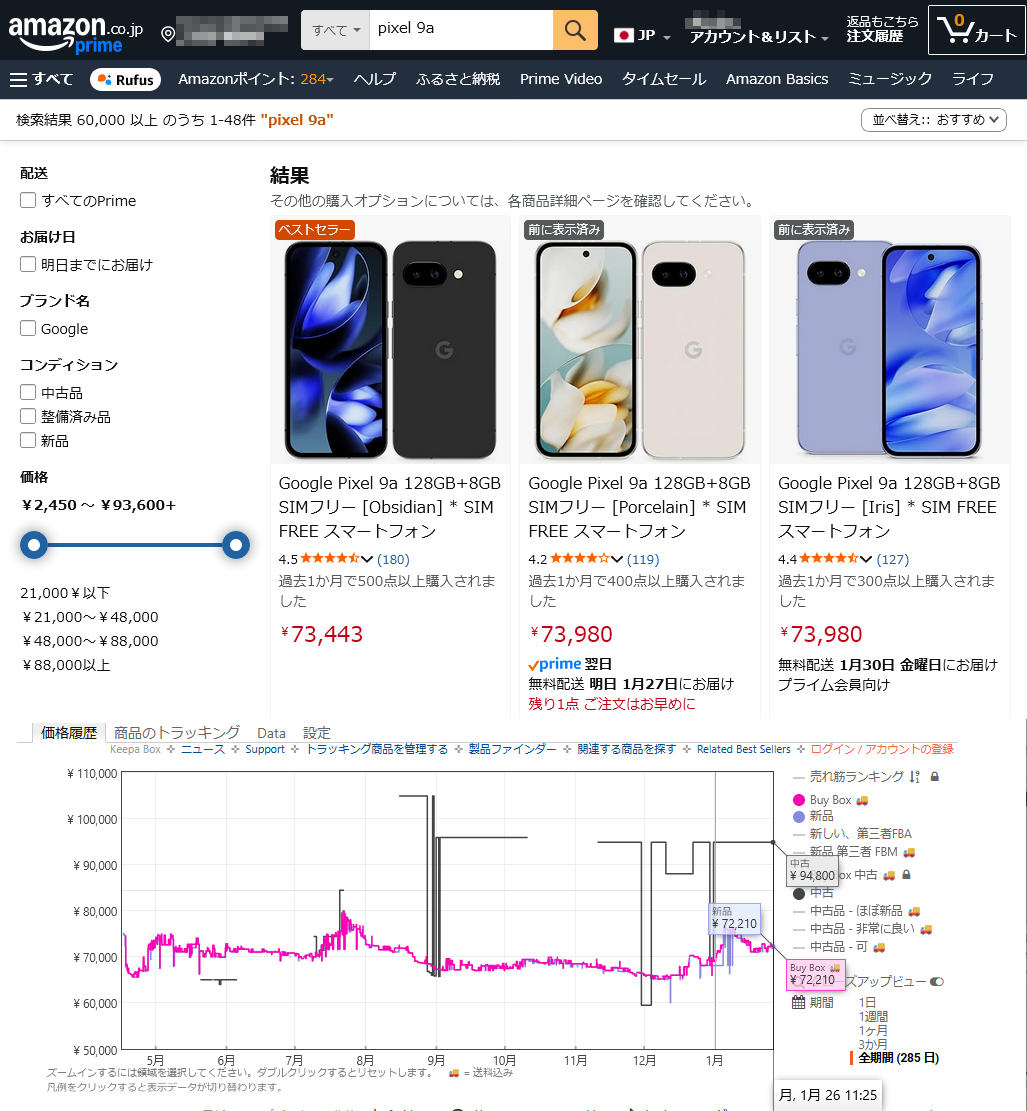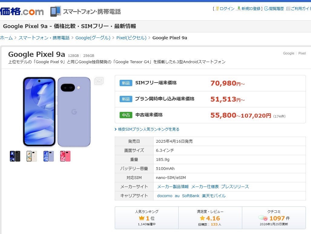 1世代前のPixel 8aでは、年明け(2025年1月)には価格下落が始まり5万円台になっていた。やはり、今年はDRAM価格の暴騰が価格下落圧力を跳ね返して、そろそろ次世代機が発表されるのに価格がじり高になっているのかもしれない。
