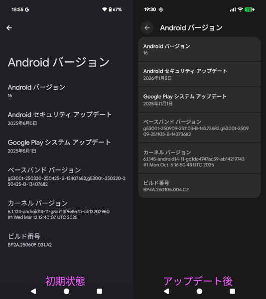 初期状態、アップデート後ともにAndroid 16で、セキュリティー アップデートは2026/01/05版、Google Playシステム アップデートは 2025/11/1版が適用されている。