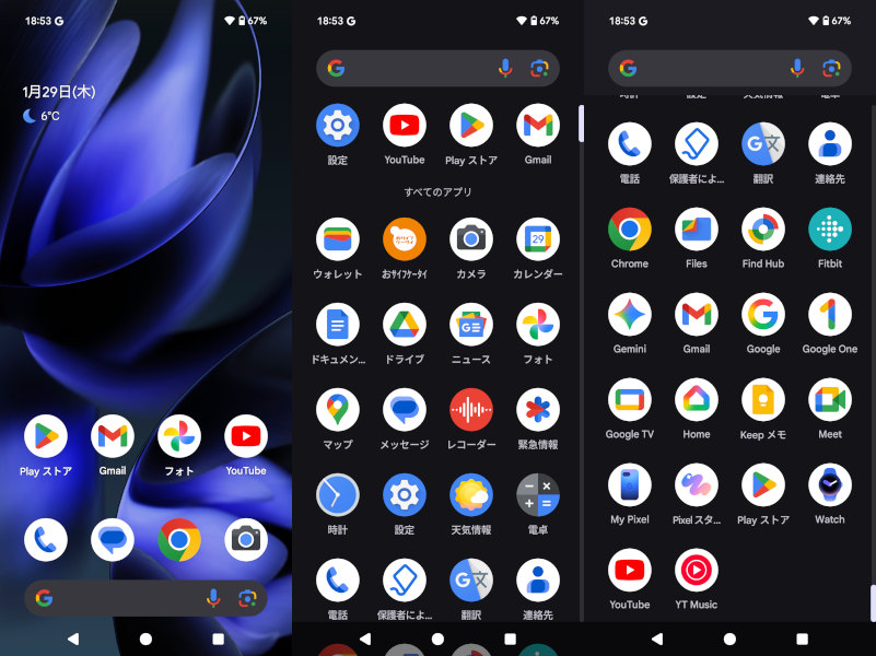 キャリア(docomo)のアプリはプリインストールされている気配はない。クリーンなAndroid端末だ。