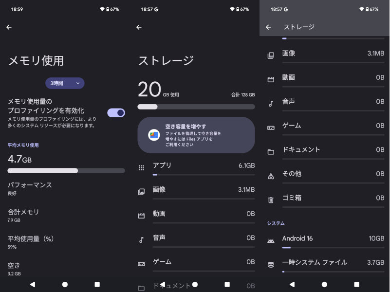 メモリーは 4.7GBytes / 7.9GBytes 使用済。ストレージは 20GBytes / 128GBytes 使用済。なお、ストレージのうち10GBytesはAndroid16のシステムが利用している。