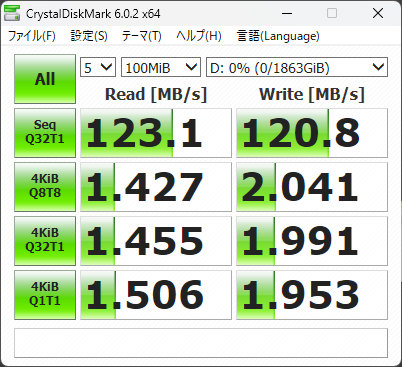 $ sudo hdparm -Tt /dev/sdb /dev/sdb: Timing cached reads: 25834 MB in 1.98 seconds = 13036.17 MB/sec Timing buffered disk reads: 376 MB in 3.01 seconds = 124.88 MB/sec $ dd if=/dev/urandom of=/media/vm/ADATA\ HV300/test.dat bs=1G count=1 conv=fdatasync 1+0 レコード入力 1+0 レコード出力 1073741824 bytes (1.1 GB, 1.0 GiB) copied, 12.9811 s, 82.7 MB/s $ ll system.img -rw-rw-r-- 1 vm vm 2394947584 2024-10-04 17:45:46 system.img $ time (cp ./system.img /media/vm/ADATA\ HV300/ && sync) real 0m20.988s → 2,394,947,584÷1,024÷1,024÷20.99 = 108 MBytes/sec user 0m0.019s sys 0m1.464s