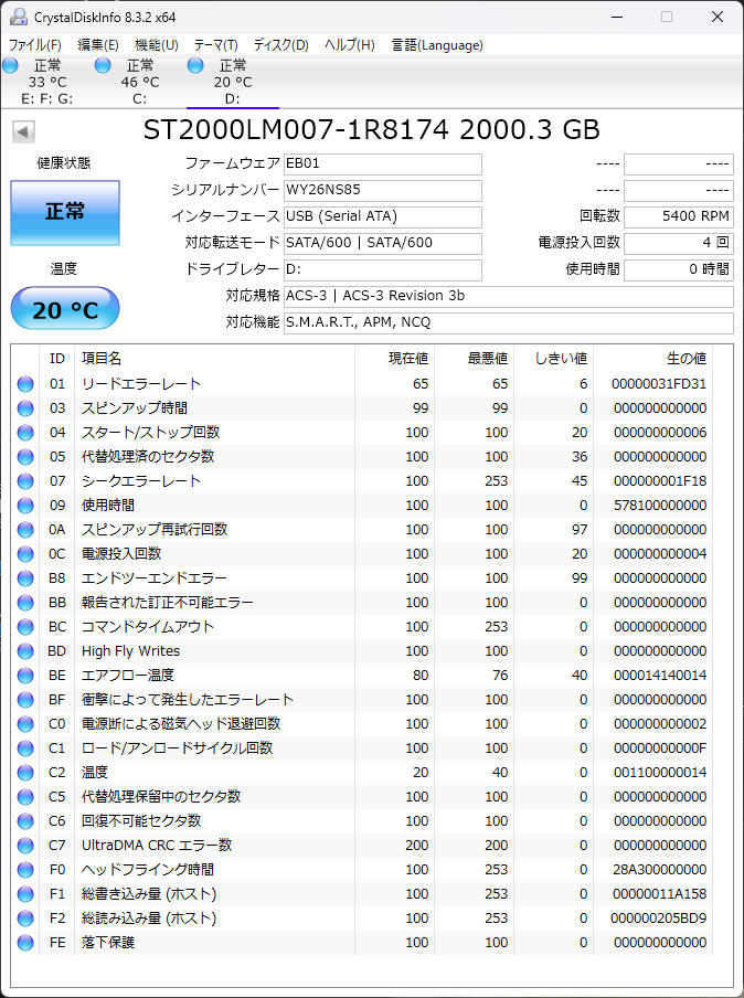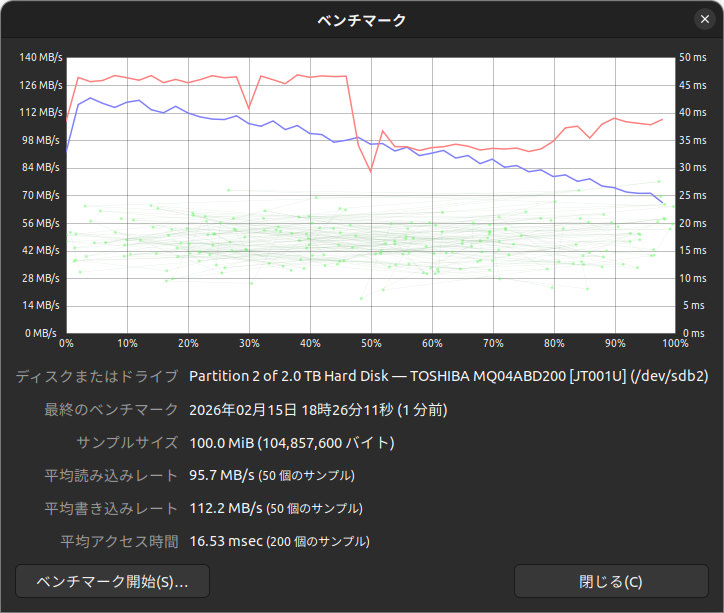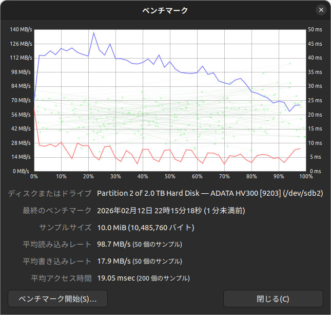 試しに、ほかのHDDで試してみると正常である。つまり、Seagate製HDD ST2000LM007またはADATA製AHV300ケースとgnome-disksの「相性問題」が発生しているのだろう。ST2000LM007がSMRディスクであるというが影響しているのかはわからない。
