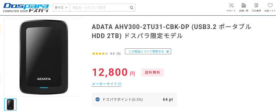 今回は、最も安価となったADATA製AHV300-2TU31を購入することとする。