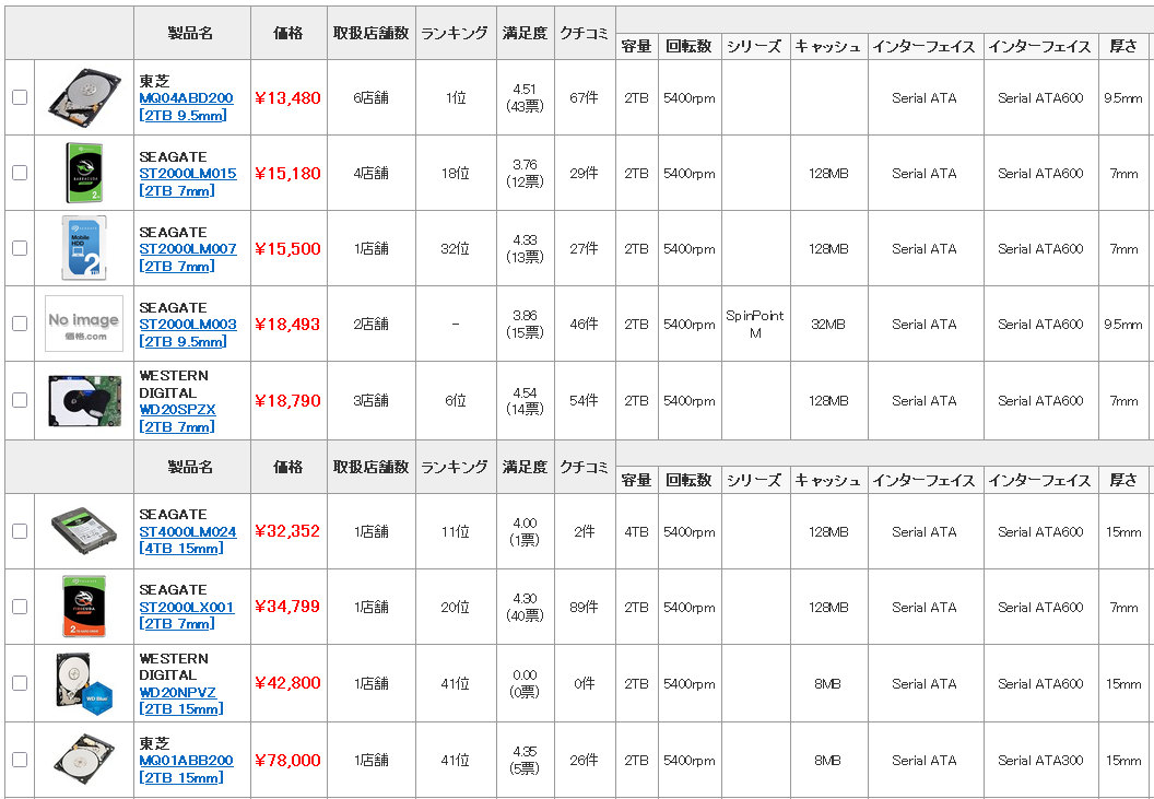 最安値が東芝製MQ04ABD200で13,480円。USB変換ケースが500円〜1,000円の別売りなので、ポータブルHDDとしては14,000円程度と考えてよい。