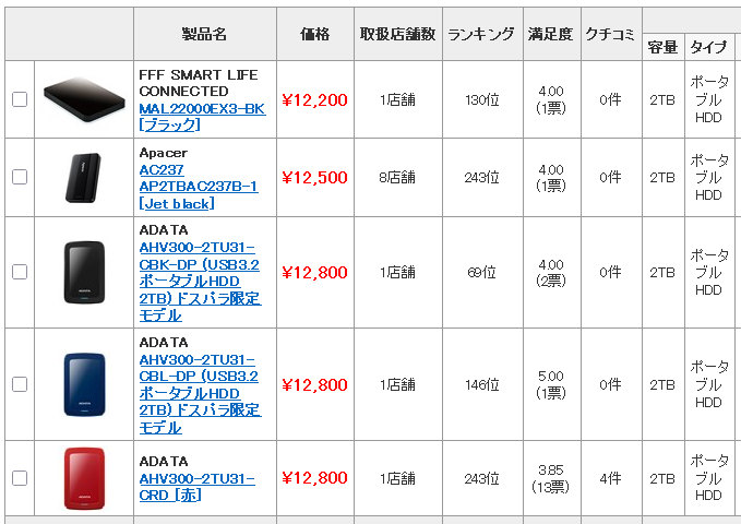 著名なメーカー製の最安値はADATA製AHV300-2TU31で12,800円となっている。