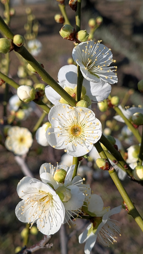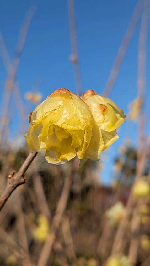 早咲き品種の冬至・寒紅は1月上旬から咲いているため、近づいてみるとしおれつつある花も多い。