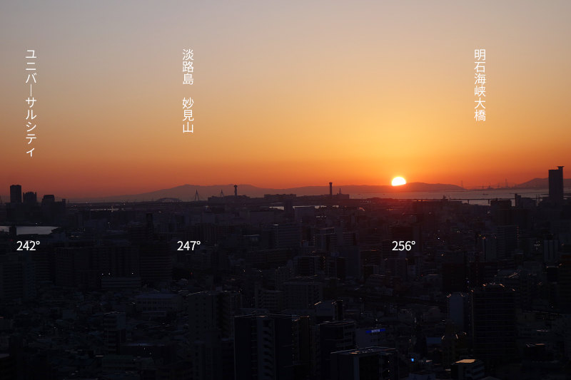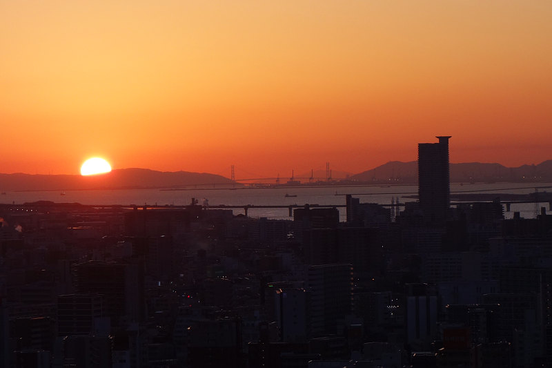2月17日の日没。すぐ右側に明石海峡大橋が見えている